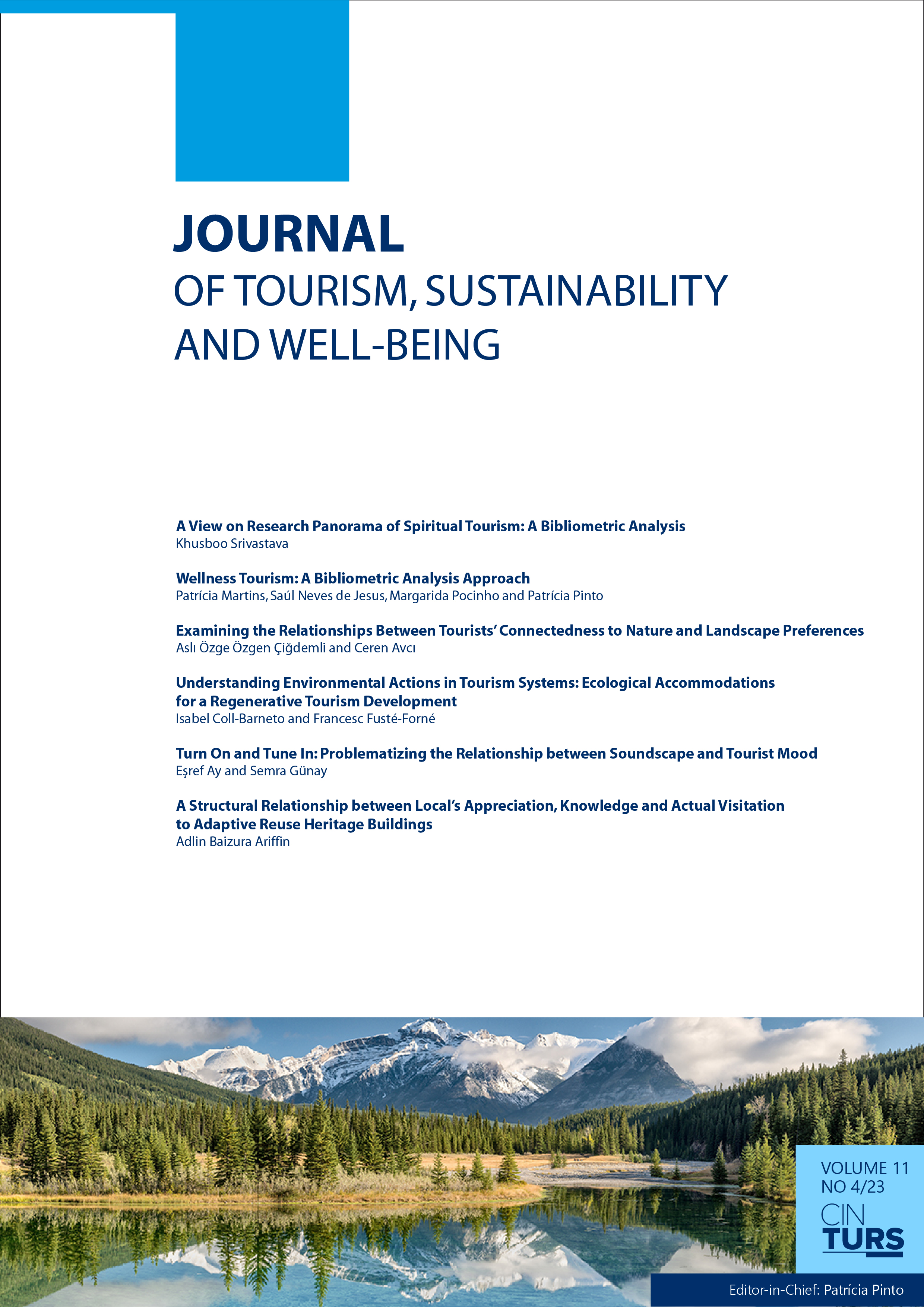 The collection of articles presented at the end of 2023 in the JTSW sheds light on crucial aspects of the relationship between tourism, well-being, and sustainability. Article 1 is a bibliometric analysis of spiritual tourism. By pinpointing the current state of research in this area, it provides a comprehensive overview of how far spirituality-based studies have progressed within the broader context of tourism. Article 2 delves into wellness tourism, a subset of health tourism, emphasizing its role in stress reduction and the promotion of positive emotions among tourists. Through a bibliometric analysis, this article offers insights into the evolving landscape of wellness tourism research. Article 3 presents a quantitative study exploring the correlation between tourists’ connectedness to nature and their landscape preferences. The findings of this research offer valuable insights for destination planners, helping them manage landscapes effectively and utilize resources sustainably to enhance the overall tourist experience. Article 4 takes a qualitative approach to investigate the role of ecological hotels as agents of change toward a regenerative tourism system. This article contributes to our understanding of how the hospitality industry can play a pivotal role in fostering sustainability and environmental consciousness. Article 5 adopts a quantitative approach to demonstrate how soundscape influences tourist mood and the overall destination experience. By utilizing a theme park as a research setting, this study provides valuable insights into the sensory aspects of tourism, offering practical implications for destination managers seeking to enhance visitor experiences through soundscaping strategies. At last, Article 6 explores how the adaptive reuse of historical buildings can be stimulated by visitors’ knowledge of the historical and cultural background of the structure. This quantitative study investigates the impact of visitor awareness on actual visitation rates and contributes to the formulation of urban regeneration strategies for sustainable tourism development.
