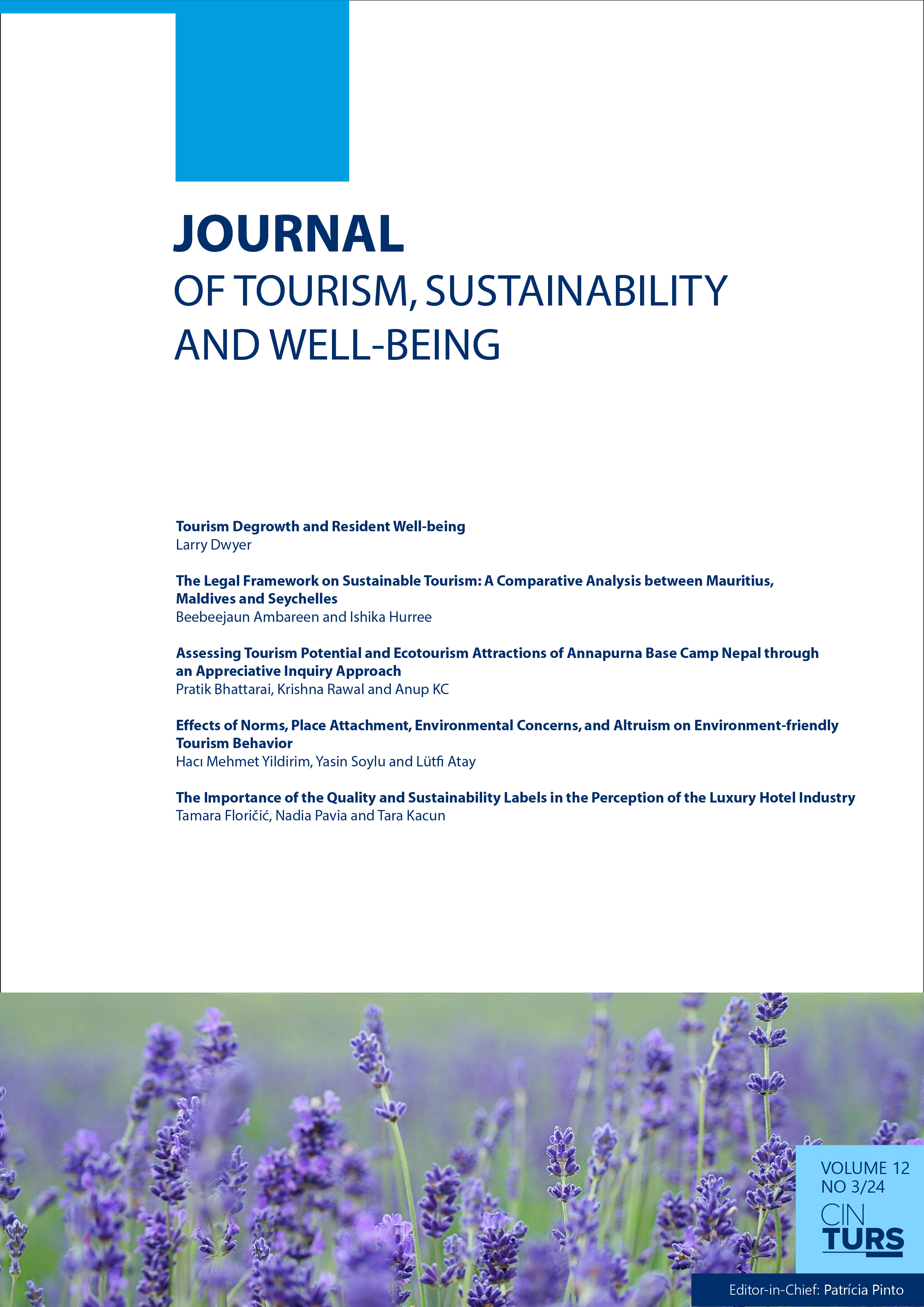 The third issue of JTSW in 2024 features five articles that critically examine various facets of sustainability in tourism, spanning social, environmental, and economic dimensions. The first article conceptualizes the well-being implications of tourism degrowth, evaluating both its positive and negative impacts on resident well-being through an established framework. The second article scrutinizes the legal framework for sustainable tourism in Mauritius, addressing emerging challenges by examining tourism laws within a sustainability context and conducting a comparative analysis with regulations in other destinations. The third article investigates the potential of tourism and ecotourism attractions at Annapurna Base Camp, highlighting the necessity of balancing social, economic, and environmental dimensions to ensure the sustainability of tourism destinations. The fourth study examines the influence of subjective and personal norms, environmental concerns, and perceptions of altruism on recreationists' environmentally friendly behaviors and environmental tourism practices. The fifth article explores the perception of luxury hotel offerings and the impact of sustainability labels and excellence awards on tourists’ preferences. This article aims to enhance the understanding of consumer attitudes when selecting luxury hotel accommodations that emphasize sustainability values. Together, these articles provide comprehensive insights into the multifaceted nature of sustainable tourism and its implications for policy, practice, and theory.
